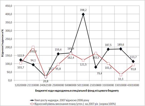 Рис.3.5. – Динаміка темпів росту та рівня виконання плану постатейних доходів в спеціальний фонд міського бюджету м.Дніпропетровська у 2007 році