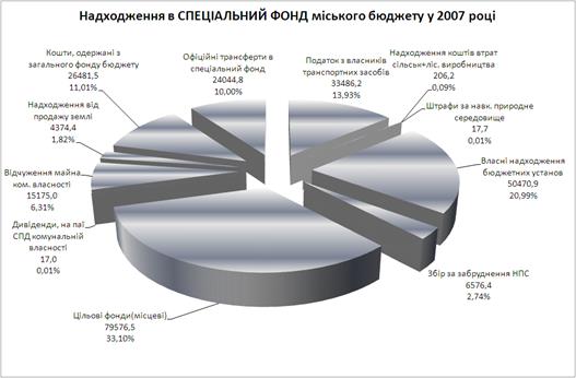 До спеціального фонду міського бюджету за 2007 рік надійшло доходів у сумі 240426,6 тис.грн., або 99,3 % до уточненого плану на рік.