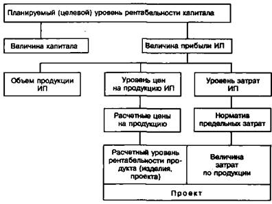 . В процессе управления анализ предшествует принятию решений. В области управления затратами плановые решения означают установление конкретных значений ожидаемых затрат, соответствующих целевым (заданным) результатам. Переход при планировании от задач ИП к задачам исполнителей осуществляется не только в разрезе подразделений (центров ответственности и др.), но и по всем продуктам (проектам, изделиям). Принципиальная схема трансформации целевых показателей рентабельности ИП в показатели рентабельности и затрат проекта дана на рис. 1.