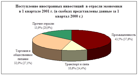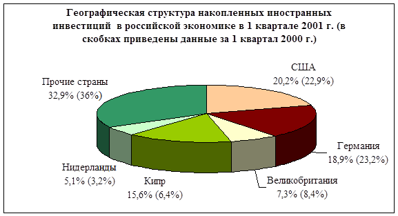 В настоящее время мы можем наблюдать некоторый рост ПИИ в экономику России. Так, для первого квартала 2001 года был характерен динамичный процесс привлечения иностранных инвестиций. По итогам января-апреля 2001 года иностранные инвестиции в российскую экономику оценивались в 2 718 млн. долл., что на 11,1% выше аналогичного показателя 2000 года.