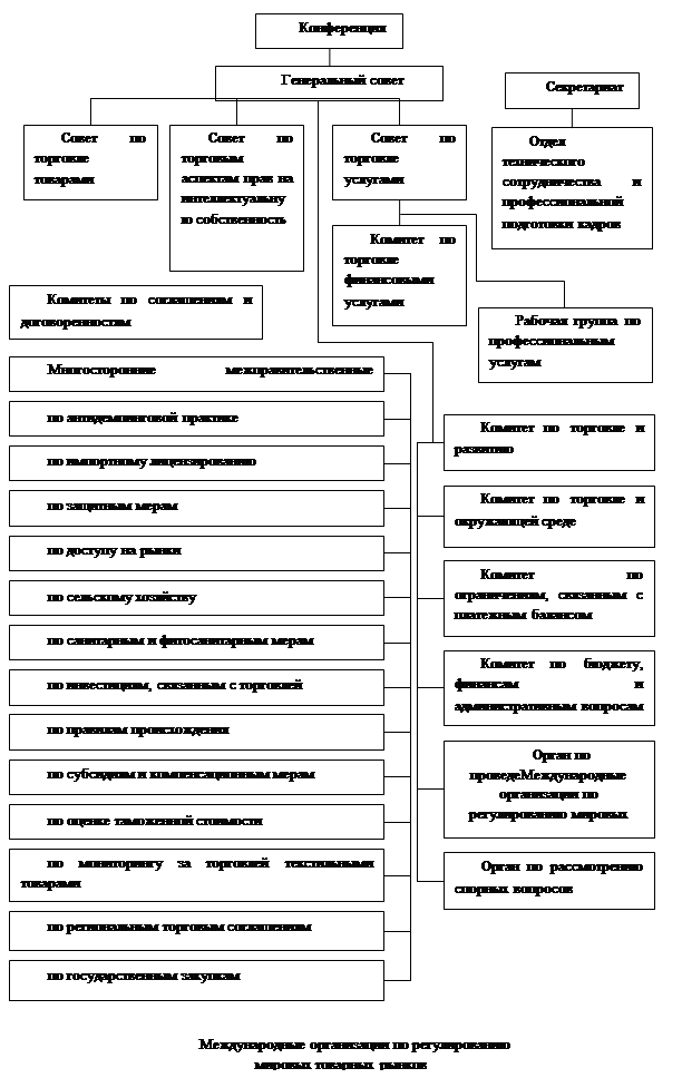 Для проведения многосторонних переговоров в рамках «Уругвайского раунда» была создана довольно сложная организационная структура в составе: специального органа – Комитета по надзору, призванного наблюдать за выполнением взятых участниками обязательств не вводить новые торговые ограничения, противоречащие ГАТТ; 15 переговорных рабочих групп – по таможенным тарифам; по нетарифным мерам; по тропическим товарам; по продукции, производимой на базе природных ресурсов; по текстилю и одежде; по сельскохозяйственным товарам; по субсидиям и компенсационным мерам; по торговым аспектам прав на интеллектуальную собственность, включая торговлю поддельными товарами; по защитным оговоркам; по функционированию системы ГАТТ; по торговым аспектам инвестиционной политики; по изменению статей ГАТТ; по соглашениям и договоренностям ММТП; по урегулированию споров; по торговле услугами.