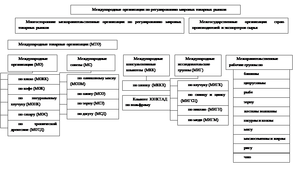 Межправительственные организации по регулированию мировых товарных рынков, именуемые Международными товарными организациями (МТО), включают: