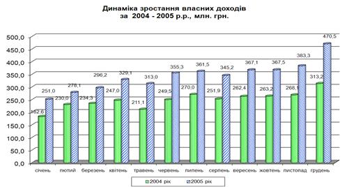 Рис.Б.1. – Динаміка щомісячного зростання надходжень власних доходів в Пенсійний Фонд України у Дніпропетровській області у 2004 2005 роках