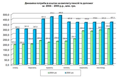 Рис.Б.2. Динаміка щомісячної потреби в коштах на виплату пенсій в Пенсійному Фонді України у Дніпропетровській області у 2004 2005 роках