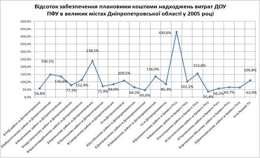 Рис.Б.4. Порівняльна таблиця забезпеченості коштами в Пенсійному Фонді України у Дніпропетровській області у 2005 році (великі міста області –порайонно)
