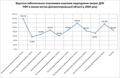 Рис.Б.5. Порівняльна таблиця забезпеченості коштами в Пенсійному Фонді України у Дніпропетровській області у 2004 році (малі міста області обласного значення )