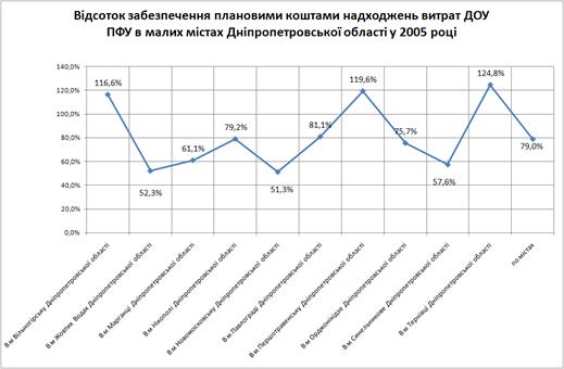 Рис.Б.6. Порівняльна таблиця забезпеченості коштами в Пенсійному Фонді України у Дніпропетровській області у 2005 році (малі міста області обласного значення )