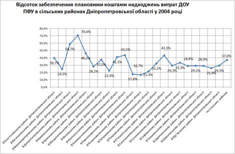 Рис.Б.7. Порівняльна таблиця забезпеченості коштами в Пенсійному Фонді України у Дніпропетровській області у 2004 році (сільські райони області)