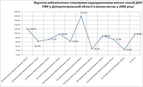 Рис.В.4. Порівняльна таблиця забезпеченості коштами в Пенсійному Фонді України у Дніпропетровській області у 2006 році (малі міста області обласного значення )