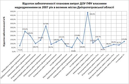 Рис.В.6. Порівняльна таблиця забезпеченості коштами в Пенсійному Фонді України у Дніпропетровській області у 2007 році (великі міста області – порайонно)