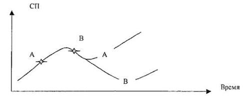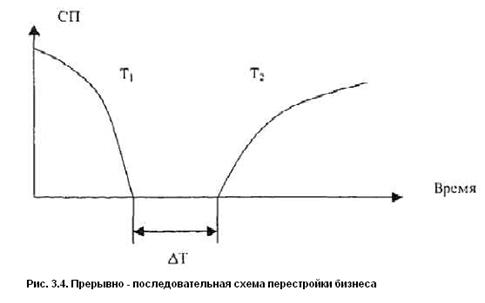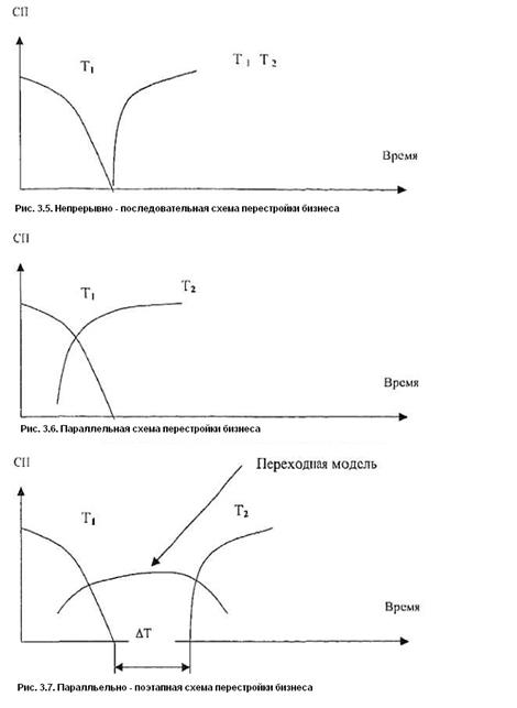 Непрерывно-последовательная схема (рис. 3.5) применяется, когда времени для структурной перестройки AT не требуется. Все осуществляется непрерывно. Например, в результате слияния или поглощения новое предприятие сразу начинает выходить из кризиса, используя дополнительные источники финансирования для покрытия долга и повышения объемов производства. Товар или товарная группа может оставаться старой Т1 или стать модифицированной Т2. Параллельную схему (рис. 3.6) применяют, когда необходима быстрая модификация товара. Параллельно на спаде продаж товара T1 ведется реализация товара Т2. В результате суммарные объемы продаж не успевают существенно снижаться, фирма получает стабильность и гарантии конкурентоспособности на рынке.