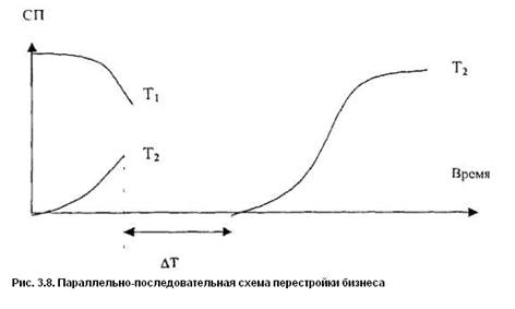 Параллельно-поэтапную схему (рис. 3.7) целесообразно применять, когда невозможен параллельный переход на новый товар Т2 и фирма вынуждена временно применять у себя переходную модель: часть характеристик у нес от старой модели, а часть уже от новой. Суть параллельно-последовательной схемы (рис. 3.8) в том, что за время AT фирма может оборудовать дополнительные мощности по освоению конкурентоспособного товара (Т2) и продолжить работу с приростом объемов реализации, выручки и прибылей. Одновременно (параллельно) с товаром Т1 (объемы реализации его падают) происходит подъем реализации товара Т2 до определенного предела, ограниченного мощностями и возможностями бизнеса. Требуется некоторое время АТ, после которого объемы реализации нового товара Т2 могут и далее возрастать, ведя за собой в рост выручку, прибыль и другие показатели работы.