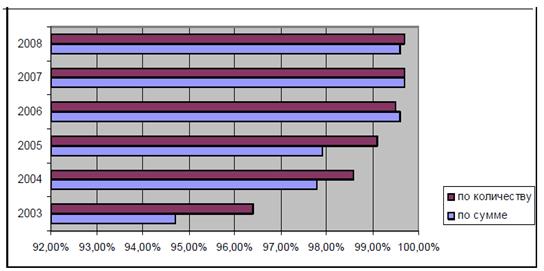 Банк России разработал стратегию развития платежной системы страны. Мероприятия по ее реализации включают создание системы расчетов в режиме реального времени, развитие негосударственных расчетных и клиринговых систем; создание условий для внедрения расчетов пластиковыми картами. Для выполнения этих задач Банк России осуществляет целенаправленную деятельность по расширению использования электронных расчетов, что дает определенные результаты [15]. Как можно видеть из статистических данных, приведённых в приложении 1, доля безналичного денежного обращения в РФ продолжает постепенный рост.