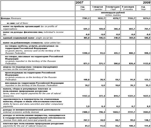Доходы федерального бюджета на 2009 г. запланированы в сумме 6,3 трлн. руб., расходы - 9,5 трлн. руб. Ожидается, что с учетом снижения доходов дефицит федерального бюджета составит около 8% ВВП. При этом ожидается, что в номинальном выражении ВВП России в текущем году сократится до 40,42 трлн. руб. (в 2008 г. - более 42 трлн. руб). Из средств Резервного фонда в 2009 г. в экономику планируется направить 2,7 трлн. руб. Это предельная сумма, которая возможна при сохранении прогноза инфляции на уровне 13-14%.
