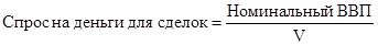 Первой причиной наличия денег является то, что люди нуждаются в деньгах как средстве обращения, то есть в удобном способе заключения сделок на приобретение товаров и услуг. Спрос на деньги для сделок применяется пропорционально номинальному ВВП и обратно пропорционально скорости обращения денежной единицы (V).