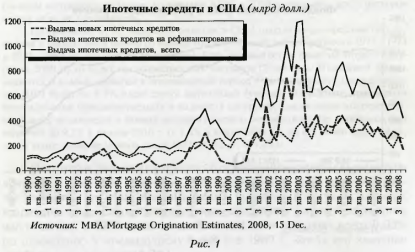 По мере вхождения экономики США в рецессию наметилась тенденция постепенного сокращения объема выданных банковских кредитов. В III квартале 2008 г. объем выданных населению ипотечных кредитов составил всего лишь 415 млрд долл. (см. рис. 1). Значительно снизились темпы прироста потребительских кредитов — в ноябре 2008 г. по сравнению с октябрем их объем сократился на 3,7%.