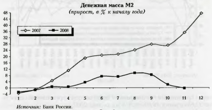 Снижение цен на нефть с мая 2008 года и ограничение заимствований на внешнем рынке вызвали существенное ослабление платежного баланса во втором полугодии. Чистый приток частного капитала в размере 83 млрд долл. США в 2007 г. превратился в его чистый отток в размере 130 млрд долл. в 2008 г. В 2008 году валютные резервы сократились на 45 млрд долл. США (а золотовалютные — на 51,7 млрд) и фактически перестали выполнять функцию источника денежного предложения. Их сокращение привело к серьезному замедлению денежного предложения. За 11 месяцев 2008 г. объем денежной массы М2 даже снизился на 0,3%, в то время как в 2007 г. за тот же период он увеличился на 35,2% (см. рис. 2).