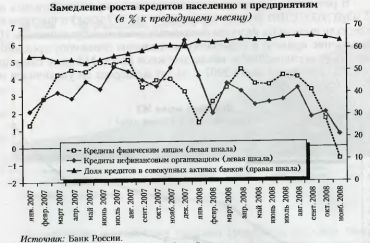 За 2008 год в России заметно снизилось количество выдаваемых кредитам населению и предприятиям (см. рис 3). В ноябре 2008 г. по сравнению с октябрем объем выданных кредитов населению даже сократился на 0,7%, прирост банковских кредитов предприятиям составил всего 0,7%. По итогам одиннадцати месяцев 2008 г. задолженность перед кредитными организациями нефинансовых организаций выросла на 32,6% против 46,9% за тот же период 2007 г.