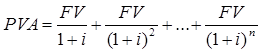 Если производится серия платежей, то в общем случае для каждого из них придется применять данную формулу. Однако расчет можно упростить, если речь идет о серии равновеликих платежей через одинаковые промежутки времени. Такие последовательности называются аннуитетами. Тогда формула расчета текущей стоимости примет следующий вид:
