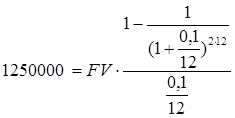 Рыночная стоимость объекта недвижимости составляет 2500000 долларов. Согласно договору купли-продажи первоначально выплачивается 50% стоимости, а оставшаяся сумма погашается в течение 2 лет ежемесячными платежами. Рассчитать величину платежей, если ставка дисконтирования (начисление процентов производится 12 раз в год) выбрана 10%.