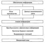 Количественное формирование процессов на предприятии связано с финансовым хозяйством, задача которого — обеспечить определенный фонд капитала для реализации всех решений. Производственно-хозяйственные процессы и их изменения сопровождаются связыванием капитала и его высвобождением, т.е. процессами инвестирования и финансирования. Связанные с ними движения финансовых средств должны быть отражены в финансовом плане. Финансовое планирование выполняет функцию учета и переработки финансовых последствий всех принятых при планировании производства решений. Процесс финансового планирования начинается с получения информации из планов производства и данных аналитического учета. Затем эта информация анализируется и преобразуется в финансовую информацию. Наконец, с помощью прогнозирования поступлений и выплат через соответствующие мероприятия пытаются прийти к выравниванию платежей. На рис. 10.11. приведена схема процесса финансового планирования.