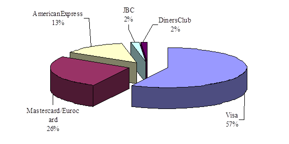 На сегодняшний день в мире крупнейшими международными платежными системами эмитировано свыше 2 млрд. пластиковых карточек. Доля каждой из них представлена на рис. 7. Такие результаты достигнуты за счет грамотной маркетинговой политики компаний, направленной на определенные сегменты рынка. Только постоянное обновление и расширение линейки услуг, позволяет им на протяжении нескольких десятилетий оставаться лидерами «карточного» бизнеса.