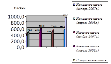 Как видно из таблицы 1, для анализа мы взяли 4 направления (Калужское, Киевское, Новорижское и Рублево – Успенское шоссе), которые с точки зрения инвестирования считаются наиболее перспективными. Все участки были подобраны по следующим показателям: разрешенное использование (назначение) – индивидуальное жилищное строительство, отдаленность от МКАД от 1 км до 20 км, наличие инженерной инфраструктуры – газоснабжение, водоснабжение, энергоснабжение, хорошие подъездные пути (асфальт). По выбранным ценам мы рассчитали среднюю стоимость земли за 1 сотку и представили полученные данные в диаграмме (рис. 1).