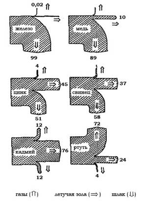 На рис. 1 показано, как распределяются выбросы металлов между выбросом в воздух, пылью iа фильтрах и шлаком, вытекающим из сжигателя. Естественно, что почти все железо (99%) уходит в шлак, но уже медь частично летит с пылью и именно она ответственна за образование диоксинов в зонах охлаждения газов.
