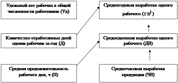 Аналогичным образом анализируется изменение среднегодовой выработки рабочего, которая зависит от количества отработанных дней одним рабочим за год, средней продолжительности рабочего дня и среднечасовой выработки: