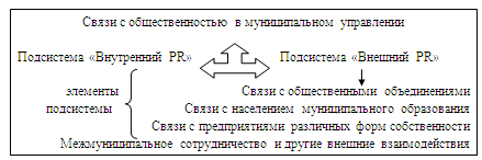 Установление связей между местными органами власти и общественностью способствует созданию внешней и внутренней среды, благоприятной для эффективного муниципального управления, что, в свою очередь, служит проводником обратной связи во властно-управленческих отношениях. Социально-коммуникативные отношения, складывающиеся в процессе связей с общественностью у организационных структур, в том числе и муниципальных, уже давно стали значимой сферой деятельности наиболее социально развитых стран, насчитывая уже почти вековую историю. Аббревиатура "PR", или в русской транскрипции "ПР", – англо-американское наименование деятельности государственных и муниципальных органов власти, организаций и учреждений, направленной на установление, упорядочение и развитие связей с общественностью в целях достижения взаимопонимания и взаимодействия [2, с. 169].