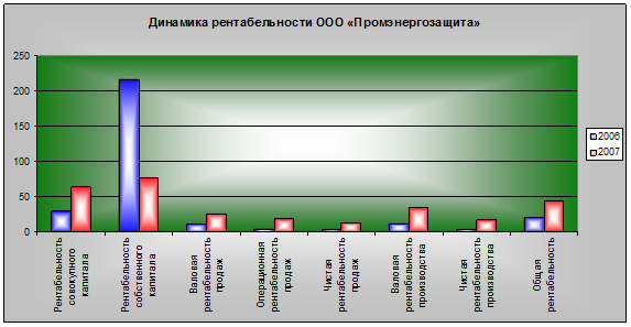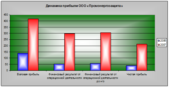 Согласно таблицы 4.3. можно сделать вывод, что за два исследуемых периода наблюдается устойчивая тенденция увеличения показателей чистой прибыли. В 2007 году по сравнению с 2006 годом она увеличилась на 435,9%. В 2007 году по сравнению с 2006 годом темп роста валовой прибыли значительно увеличился и составил 197,2% роста, что свидетельствует о росте объёмов производства.