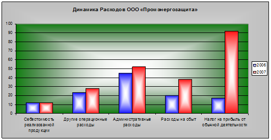 Согласно Таблице 4.2. можно сделать вывод, что на предприятии ООО «Промэнергозащита» за два исследуемых периода прослеживается тенденция роста расходов. В 2007 году по сравнению с 2006 годом они увеличились на 863,4%.