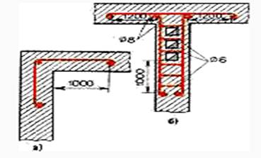 Рисунок 1 – армирование угла и примыкания внутренней стены к наружной, а) – в углах, б) в местах прохождения каналов