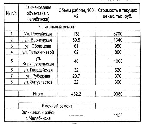Из анализа произведенных работ за 2007 год (см п. 1.4.) мы можем сказать, что средняя цена проведение укладки дорожного покрытия составляет 21 тыс. за 100 м.2
