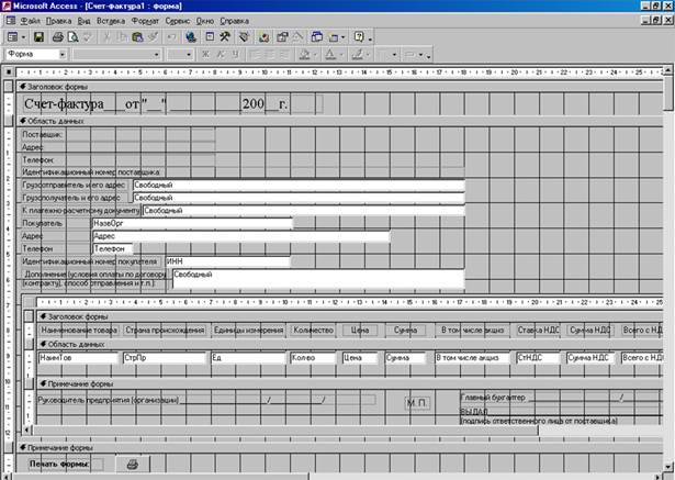 Выходная информация, согласно заданию, должна быть представлена в виде формы для просмотра и редактирования выданного счета-фактуры. Данный выходной документ должен быть сформирован средой MS Access.