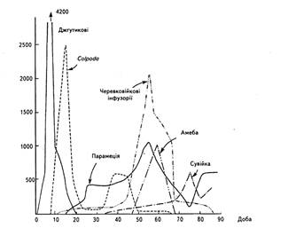 Рис. 2. Сукцесії простіших в настої сіна. Зміна кількості особин залежно від віку культури, в днях: По осі ординат — кількість індивідів різних видів в см3