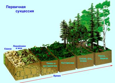 У природі первинні сукцесії зустрічаються порівняно рідко і продовжуються значно довше вторинних - до декількох сторіч. Первинна сукцесія - це заростання місця, раніше не зайнятого рослинністю: голих скель або застиглої вулканічної лави. Жити на такому ґрунті здатні лише деякі рослини, них називають піонерами сукцесій. Типові піонери - мохи і лишайники. Вони змінюють ґрунт, виділяючи кислоту, що руйнує і розпушує камені [4]. Мохи, що відмирають, і лишайники під дією бактерий-редуцентов розкладаються, а їхні залишки перемішуються з пухким кам'янистим субстратом (піском). Так утвориться перший ґрунт, на якій уже можуть рости інші рослини. Необхідність руйнування материнської гірської породи - головна причина повільного ходу первинних сукцесій; відзначте збільшення товщини ґрунтового шару в міру сукцесії. На ґрунті, бідної живильними речовинами, поселяються трави, що більш конкретно здатні і витісняють лишайники і мохи. Корені трав проникають у тріщини кам'янистої породи, розсовують ці тріщини і руйнують камінь усе більш. На зміну травам приходять багаторічні рослини і чагарники, наприклад, вільха і верба. На коренях вільхи знаходяться клубеньки - спеціальні органи, що містять симбиотические бактерії, що фіксують атмосферний азот і сприяють нагромадженню в ґрунті великих його запасів, за рахунок чого ґрунт стає усе більш родючою. Тепер на ній уже можуть рости дерева, наприклад сосна, береза і ялина. Таким чином, рушійною силою сукцесії є те, що рослини змінюють ґрунт під собою, впливаючи на її фізичні властивості і хімічний склад, так що вона стає придатної для виглядів-конкурентів, що витісняють первісних мешканців, викликаючи зміну співтовариства - сукцесію (згадаєте ілюстрації до параграфа 1.4: у силу конкуренції рослини далеко не завжди живуть там, де умови для них краще).