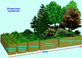 У місцях, де господарська діяльність людей не утручається у взаємини організмів, складається климаксовое співтовариство, що може існувати невиразно довгий час - доти, поки який-небудь вплив ззовні (оранка землі, рубання лісу, пожежа, виверження вулкана, повінь) не порушить його природну структуру. У випадку руйнування співтовариства в ньому починається сукцесія - повільний процес відновлення вихідного стану. Приклади вторинних сукцесій: заростання закинутого поля, лугу, гари або вирубки. Вторинна сукцесія триває кілька десятків років. Вона починається з того, що на звільненій ділянці ґрунту з'являються однолітні трав'янисті рослини. Це - типові бур'яни: кульбаба, осот, мати-і-мачуха й інші. Їхня перевага в тім, що вони швидко розростаються і роблять насіння, пристосовані до поширення на далекі відстані за допомогою вітру або тварин. Однак уже через два-три роки їх витісняють конкуренти - багаторічні трави, а потім - чагарники і дерева, насамперед осика. Ці породи затінюють землю, а їх великі кореневі системи забирають із ґрунту усю вологу, так що проросткам видів, першими попавших на поле, стає важко рости. Однак сукцесія на цьому не зупиняється; за осикою з'являється сосна; а останніми - повільно зростаючі тіньовитривалі породи, наприклад ялина або дуб. Через сто років на цій ділянці відновлюється те співтовариство, що було на місці полючи до зведення лісу й оранки землі [4].