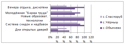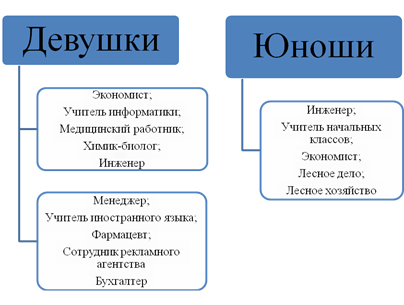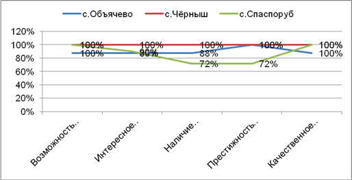 Исходя из данных таблицы, можно судить о том, что Сыктывкарский Лесной институт по многим показателям занимает лидирующее положение. Так юноши объячевской СОШ считают, что в СЛИ обучается больше студентов, тут же самые лучшие учебные корпуса, самые востребованные специальности, более профессиональные преподаватели, самый большой конкурс при поступлении и после его окончания выпускники легче находят работу. Девушки же считают, что больше студентов обучается в СГУ и там самый большой конкурс при поступлении. И одновременно они согласны с юношами, что в СЛИ самые востребованные специальности и после его окончания выпускники легче находят работу.