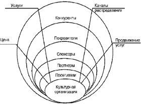 Внешней средой маркетинга является окружающая среда, на которую фирма выходит со своими маркетинговыми мероприятиями. В сфере культуры она включает реальных и потенциальных посетителей, спонсоров, покровителей, партнеров, конкурентов, а также общественность в лице СМИ и иных лиц, формирующих общественное мнение как о работе культурной организации, так и о культуре в целом (см. рис. 3).