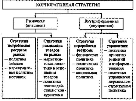 При выборе стратегии необходимо выяснить, о каком уровне стратегии идет речь, поскольку в настоящее время в условиях нестабильной внешней среды предприятий при наличии широких возможностей для диверсификации действуют многоуровневые корпорации, осуществляющие одновременно несколько видов деятельности на многих рынках и действующие во многих отраслях. Для таких корпораций существуют три уровня стратегии: корпоративная стратегия, деловые стратегии, функциональные стратегии.