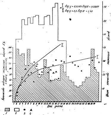 По-видимому, учет можно было бы считать законченным, как только в ловушки перестанут попадаться немеченые зверьки (Н. И. Ларина, 1957), но при закладке учетных площадок среди обширных биотопов достичь такого положения нелегко. Теоретические расчеты (вычисление эмпирической формулы кривой развития процесса вылова) показывают, что продолжительность периода, требующегося для полного вылова обитателей площадки, зависит от уровня численности. В случае, когда на 100 ловушек ежедневно ловилось до 70 зверьков, учет должен завершиться на 15-е сутки. При ежедневном вылове (на такой же площади и при том же количестве ловушек) 20—30 зверьков, представляется возможным достичь их полного учета лишь через 40. суток. Однако практически (рис. 3) количество меченых зверьков в уловах быстро возрастает в первые дни учета, а затем, достигнув 60—70% от общего количества вылавливаемых зверьков, продолжает колебаться около этого уровня. Такое состояние, когда помечено не менее двух третей обитателей площадки, достигается уже к концу двухнедельного учета. По этим данным можно составить достаточно ясное представление об уровне численности грызунов в данной местности. Дальнейшие исследования должны решить вопрос о необходимой продолжительности учета при разной численности и подвижности грызунов.