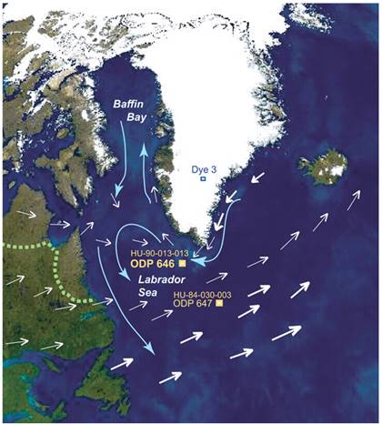 Основной материал был получен со станции глубоководного бурения № 646, расположенной в северной части Атлантики, к юго-западу от южной оконечности Гренландии. Анализировались верхние 76 м отложений, что соответствовало миллиону лет от настоящего момента (рис. 1)