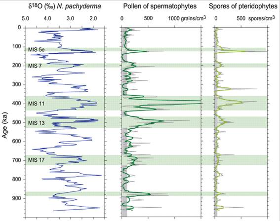 Анализ пыльцы и спор, содержащихся в колонке отложений, выявил большие (с амплитудой в сотни и тысячи раз) колебания концентрации пыльцевых зерен. Максимумы приходились на периоды потеплений, причем особенно высокая концентрация пыльцы отмечалась для отложений возрастом около 400 тыс. лет (рис. 2). Предположение о том, что тогда было сильное потепление, уже делавшееся ранее на основе изотопного анализа кальцита донных отложений (так называемая 11-я «морская изотопная стадия» — Marine Isotope Stage 11, MIS 11), в данной работе получило независимое дополнительное подтверждение [1].