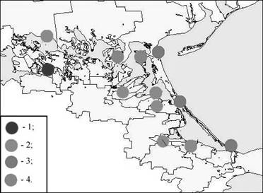 На рис. 4.1 показано карту-схему, де позначено рекомендовані місця розміщення стаціонарних постів спостережень на Сиваші. Відповідно до цієї схеми на Сиваші має бути 1 поста категорії І, 6- категорії ІІ, 3 - категорії ІІІ, та 2- категорії 4. Усього 12 стаціонарних постів спостереження.За умови відсутності достатнього фінансування можна скоротити кількість пости спостереження – залишити їх в районах найбільшого антропогенного навантаження. Озерні екосистеми це специфічні об’єкти, які потребують спеціальних методів дослідження і спеціальних програм спостереження. У пунктах 1 та 2 категорій спостереження за гідробіологічними показниками рекомендують проводити щомісячно за скороченою програмою, щоквартально за повною програмою; в пунктах 3 категорії спостереження проводять щомісячно за скороченою програмою тільки у вегетаційний період та щоквартально за повною програмою; в пунктах 4 категорії спостереження слід проводити щоквартально за повною програмою [33]. Досліджуваний хімічний та параметричний склад, визначається відповідно до програм спостереження, що застосовуються на постах спостереження різної категорії.