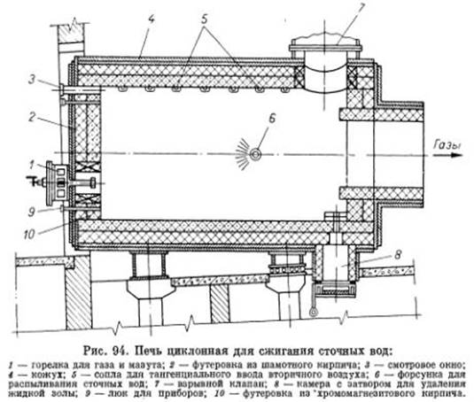Наиболее совершенными для сжигания жидких отходов являются циклонные печи, преимущества которых обусловлены аэродинамическими особенностями (вихревая структура газового потока), обеспечивающими высокую интенсивность и устойчивость процесса сжигания с малыми тепловыми потерями и минимальными избытками воздуха. Это позволяет создавать малогабаритные устройства, работающие с высокими удельными тепловыми нагрузками, в десятки раз превышающими нагрузки камерных, шахтных и барабанных печей. Широкое применение циклонные печи нашли для обезвреживания сточных вод, загрязненных органическими и минеральными компонентами. Подача воздуха и топлива осуществляется тангенциально газо-мазутными горелками предварительного смешения, расположенными на боковой поверхности камеры сгорания. Распыливание сточных вод осуществляется центробежными механическими форсунками, установленными радиально ниже зоны горения топлива.