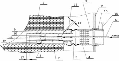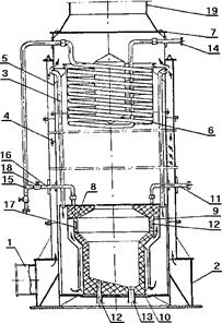 1 - входной воздушный патрубок; 2 - кольцевой канал; 3 - воздухонагревательные трубы; 4 - нижняя часть обечайки печи; 5 - верхняя часть обечайки печи; 6 - змеевиковый теплообменник; 7 - верхний фланец печи; 8,9 - воздушные сопла; 10 - камера сгорания; 11 - топливный патрубок; 12 - топливная форсунка; 13 - летка; 14 - входной патрубок в змеевиковый теплообменник; 15 - выходной патрубок из змеевикового теплообменника; 16 - продувочный патрубок; 17 - распыляющее устройство; 18 - регулировочный вентиль; 19 - патрубок для выхода дымовых газов.