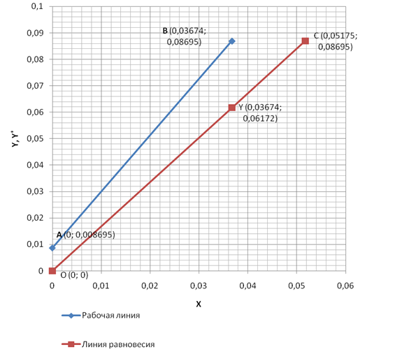 = 0, а на выходе составляет 71 % от максимально возможной в данных условиях, т.е. от равновесной с входящим газом. Уравнение линии равновесия имеет вид Y* = 1,68X