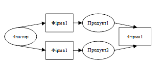 За господарські суб'єкти, що беруть участь у процесі функціонування ринку, виберемо дві фірми, кожна з яких, володіє єдиним доступним їм обом фактором, виробляє по одному виду продукції кінцевого попиту, і одного споживача, що пропонує цей попит. Умовимося, що обмін здійснюється через єдиного посередника – аукціонника. У цьому випадку економічний цикл виглядатиме так, як показано на рис. 1.