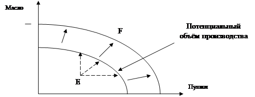 Если мы возьмем точку, находящуюся внутри области производственных возможностей (т. Е), то она тоже характеризует определенное количественное соотношение двух товаров. Но она есть результат неполного, неэффективного использования ресурсов. Выбор данной точки означал бы ориентацию на заведомо неэффективное производство, на неполное использование ресурсов.